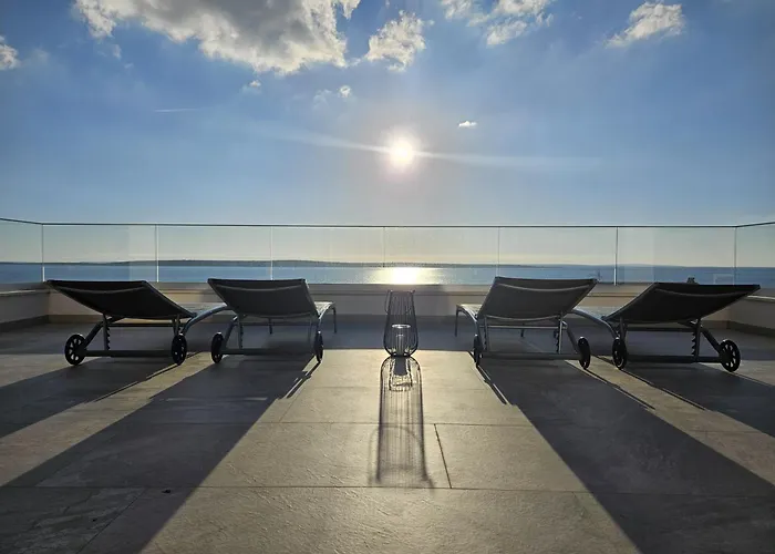 Das am Strand 1-Zimmer-Luxury Loft Apartment Mandre in Mandre liegt 80 km vom Flughafen Zadar entfernt. Von einer Terrasse dieses Apartments aus können die Gäste einen Küsten- Blick aufs Meer genießen.